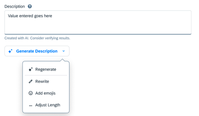 Clicking the AI button initiates content generation with AI. As the generation process begins, the AI button transforms to the Stop Generating button, enabling users to stop generation at any time (please see AI Progress Indicator). Primary actions, if there is any, are disabled until generation is complete, preventing users from accessing partially generated content.