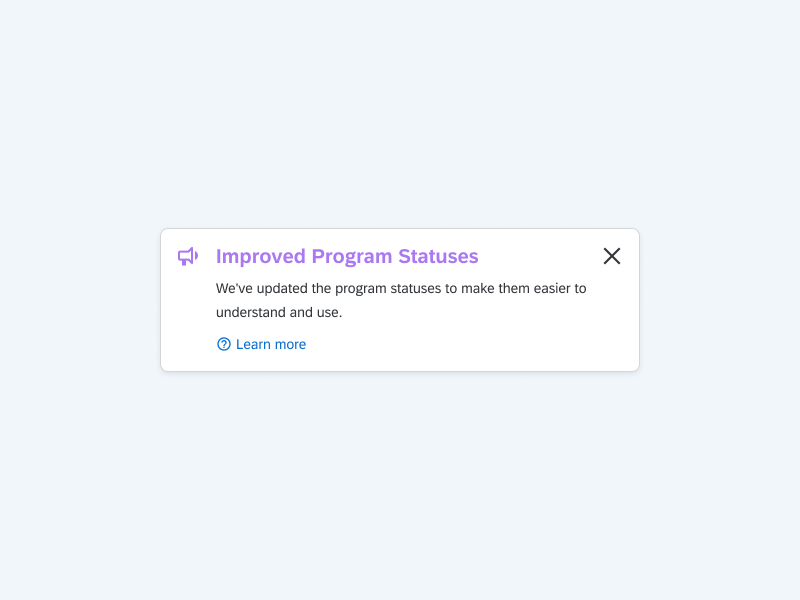 For product news that only affects an individual product, we recommend using the inline Notification component on the UI. Unlike the What's New Dialog, these inline Notifications have to be implemented by the product teams.